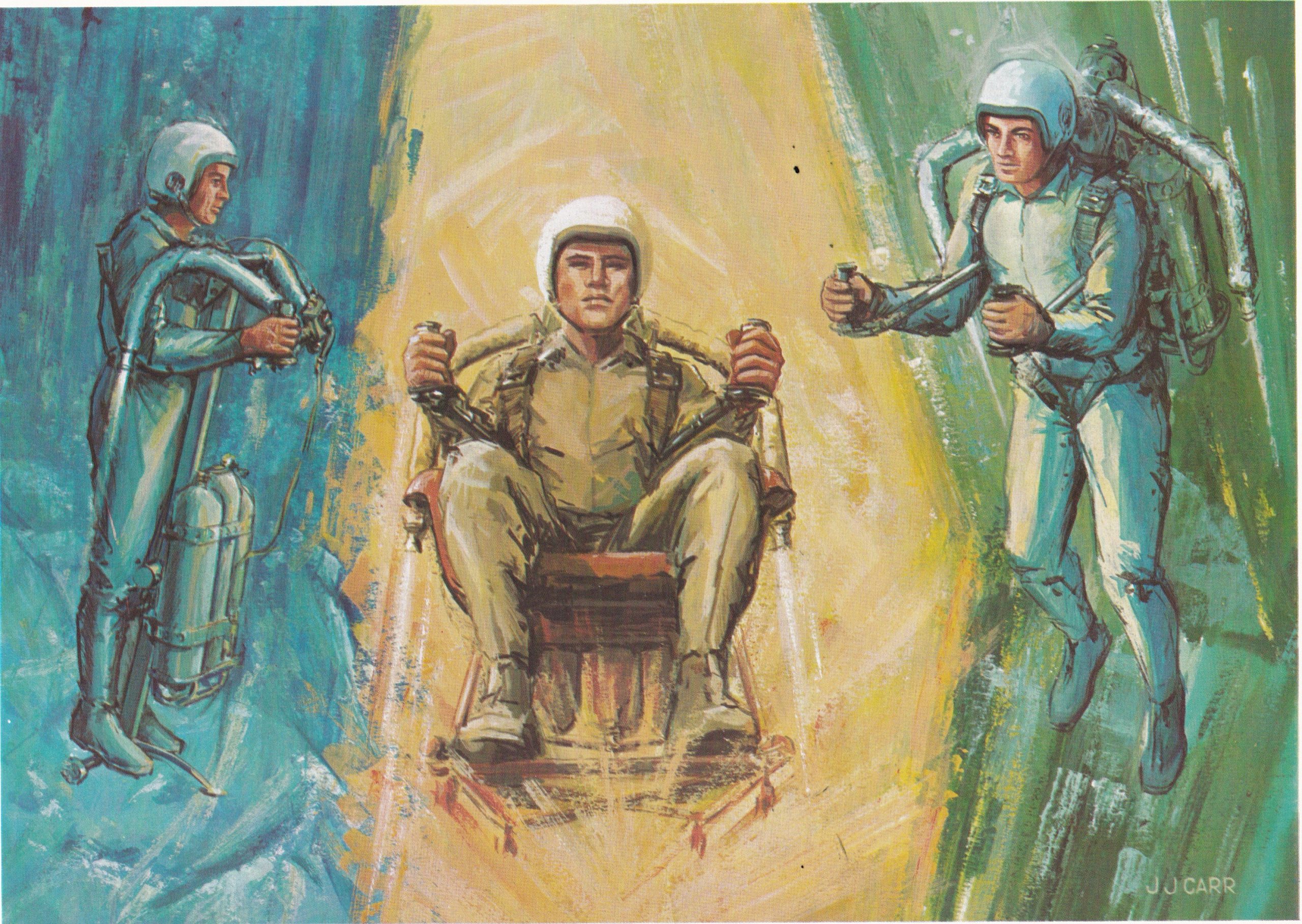 Moore was the first test pilot for the rocket belt, running indoor tethered flights until an accident broke his knee cap in 1960. In 1961, a different pilot, Hal Graham, ran the first successful rocket belt test, and later a series of public demonstrations. Graham flew the rocket belt in front of John F. Kennedy at Fort Liberty, where the president is said to have been slack jawed watching a man glide through the air.