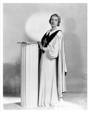 In 1923, she opened the Angelus Temple—the largest church in America. The “million dollar temple” seated 5,300 people with a stage for a 100-person choir, full orchestra, and elaborate sets. The ceiling was painted blue like the heavens, dotted with puffy clouds.