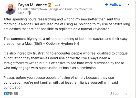 Which brings us back to Bryan Vance and his Reddit troubles. Around 2024, people noticed that ChatGPT and other large language models had developed an em dash habit. The punctuation appeared so frequently in AI-generated text that younger internet users began calling it the “ChatGPT hyphen.”